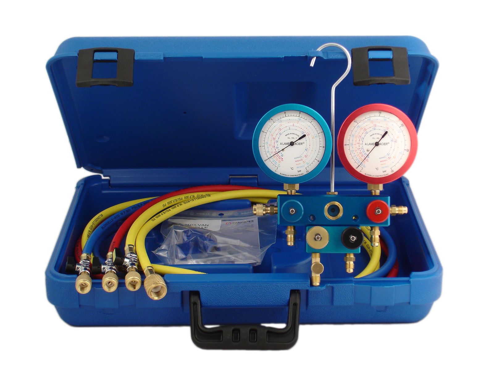 Consegnato in valigia Blondelle con 3 tubi: di color rosso, giallo e blu, di 1,5 metro con una connessione 1/4”SAE e tubo flessibile speciale vuoto di 1 m. Tappo sferico opzionale. Per il R410A, si consegnano tubi più resistenti, giunti di teflon, i tubi flessibili rossi e blu hanno una connessione 5/16” SAE nella parte curva.